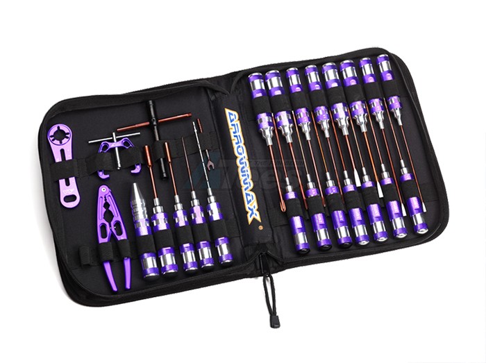 - Arrowmax have released own complete range of high quality and durable tools able to stay in the tool bag longer for a reasonable price. Tool bag start with the main tools you use in almost each class of rc racing. Included are: allen, ball allen, flat head, phillips, nut spinner, reamer and exhaust spring tool. You can up to 24-28 tools per bag, to make it more complete depending on the class you run.
