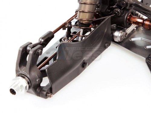 This new development for Cobra Truggy is mainly created to further improve durability and features improved differential couplers front and rear and larger bearings for same, and also larger bearings in the steering blocks and up-rights. The new coupler in the front also requires a new central front hardened shaft. The new uprights fit the new wheel-axles which feature rubber dust boots, combined with a new length rear CVD driveshaft. The steering blocks are same as from the Cobra buggy, and those had the larger bearings already while ago and are in use on many Cobra truggies too.