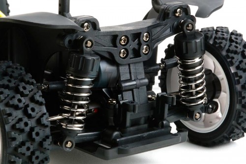 The 4WD XV-01 chassis offers dynamic R/C rally driving on both tarmac and gravel surfaces. It features a front-motor, belt-driven 4WD layout with front and rear enclosed gearboxes equipped with gear differential units. The box-like main frame incorporates covers and wheel well liners to provide superb protection against dirt and debris. The 4-wheel double wishbone suspension ensures plenty of suspension stroke and ground clearance and is matched with Rally Block Tires on replica wheels for realistic handling.